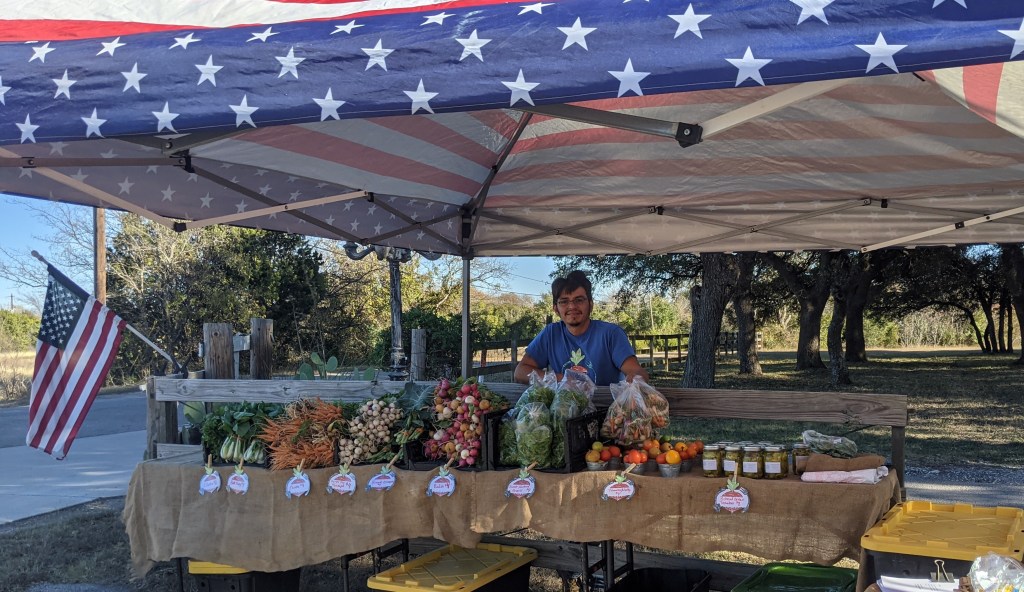 We came across one of the coolest produce stands in our area… Isle Acre Farms in Leander, TX. A small mom and pop stand run by Becky and Pete. I say small because their roadside stand is barely big enough to fit under a pop-up canopy…BUT THE FARM behind the produce stand…IMPRESSIVE AND MIGHTY.